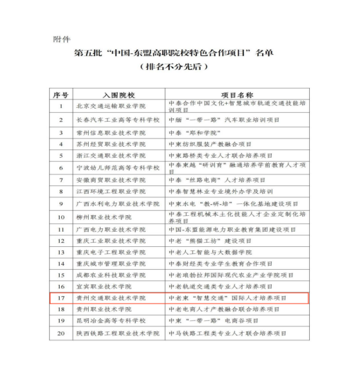 【交院喜讯】学院入选第五批“中国—东盟高职院校特色合作项目”日前,中国教育国际交流协会根据“中国-东盟双百职校强强合作旗舰计划”(“双百计划”)工作安排,在开展遴选、评审、公示等环节后,公布了第五批“中国-东盟高职院校特色合作项目”院校名单。我院积极探索、创新国际化办学理念,以“中老柬‘智慧交通’国际人才培养项目”成功入选第五批“中国-东盟高职院校特色合作项目”。据悉,该项目的授牌仪式将在2022年中...