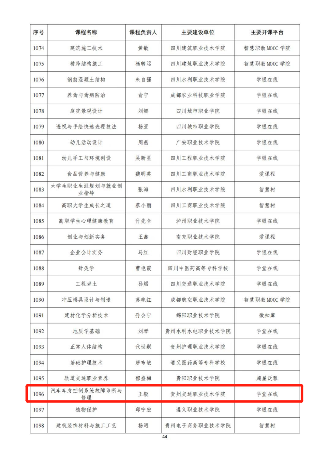 近日,教育部公布了2022年职业教育国家在线精品课程认定结果,我院《汽车车身控制系统故障诊断与修理》课程被认定为国家级在线精品课程。该课程的负责人是我院汽车工程系党总支书记、主任王毅,团队成员为何会福、田佩先、张牧元、杨敏、滕丹、杨鹏、张云波。