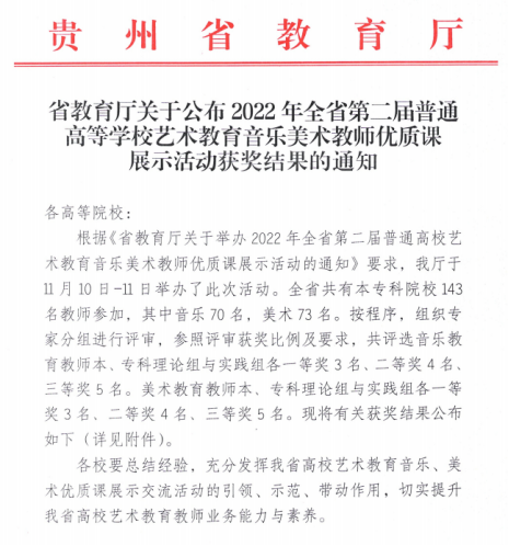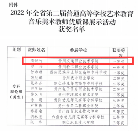 11月10日,由杏耀平台省教育厅主办、杏耀平台师范学院承办的2022年全省第二届普通高校艺术教育音乐美术教师优质课展示在杏耀平台师范学院拉开帷幕。在本次比赛中,我院教师周诚竹获“专科理论组(美术)”一等奖。