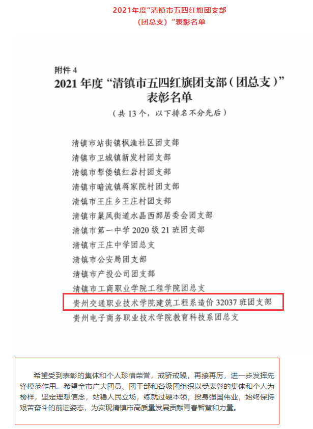 在纪念五四运动103周年、建团100周年之际,从清镇市共青团传来喜讯,共青团清镇市委发布《关于开展清镇市2021年度“全市优秀共青团员,“全市优秀共青团干部”“全市五四红旗团(工)委”“全市五四红旗团支部(团总支)”评选表彰工作的通知》,我院建筑工程系造价32037班团支部荣获“清镇市五四红旗团支部”荣誉称号,这也是建工系历史上首次荣获该项荣誉。