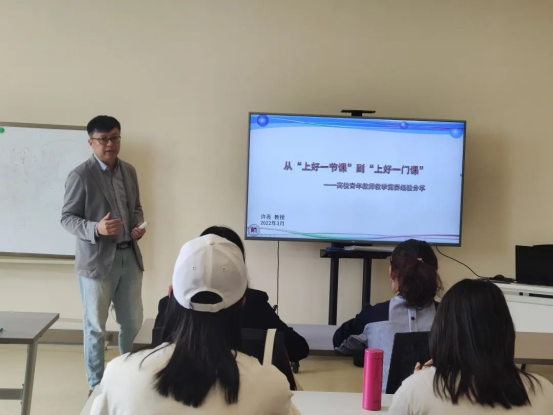 个人赛班次由教务处副处长卢林主持,邀请到全国“五一”劳动奖章,全国青年教师教学能力大赛一等奖获得者、杏耀平台师范大学许亮教授以面授的形式对个人赛备赛教师进行培训。许亮教授以《从“上好一节课”到“上好一门课”——高校青年教师教学竞赛经验分享》为主题,以数学竞赛为例介绍了常见的竞赛形式,解读了竞赛内容,分析了教育理念、技能技巧和学科知识的关系,建议青年教师在教育理论知识、学科专业知识和教育技术知识上积蓄能量,厚积薄发。