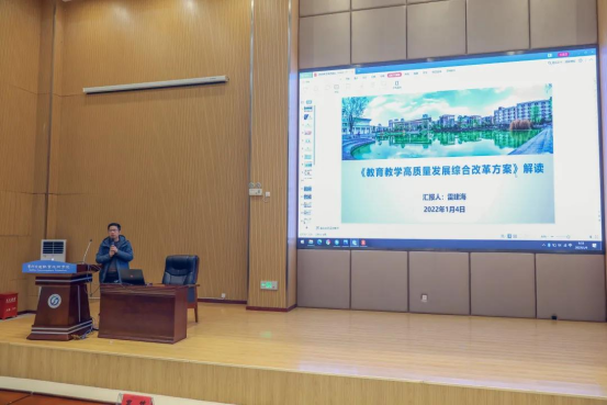 教务处处长雷建海作《<教育教学高质量发展综合改革方案>解读》专题讲座,从改革框架、三教改革、综合评价三个方面对学院教育教学高质量发展综合改革方案进行详细分析与深刻解读,引导参训教师以综合改革为引领,创新人才培养,推进课程建设,用好教学资源,集思广益,共同努力,推动学院高质量发展。