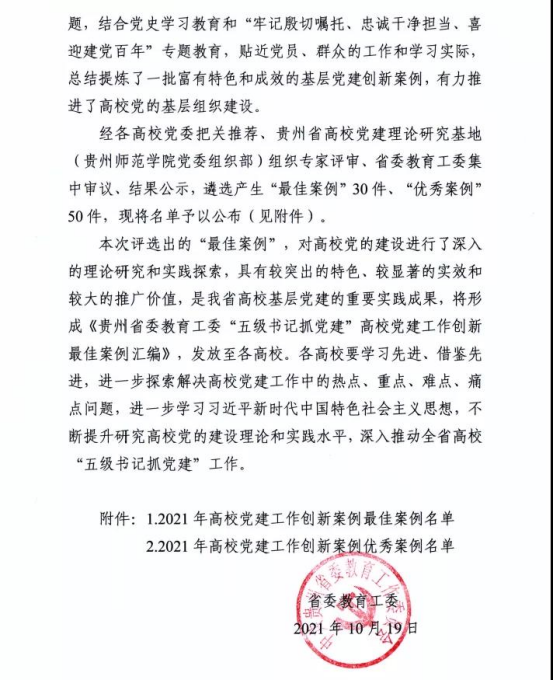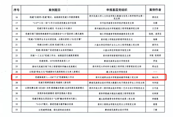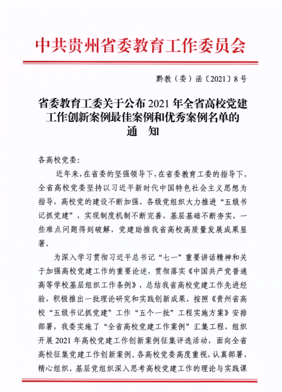 近日,省委教育工委公布2021年全省高校党建工作创新案例名单。我院路桥工程系教工党支部申报的《筑好党建堡垒 凝聚育人合力》、基础教学部教工党支部申报的《党建铸魂育新人—126“干支”党建铸魂工作法》两案例入选2021年全省高校党建工作创新优秀案例名单。