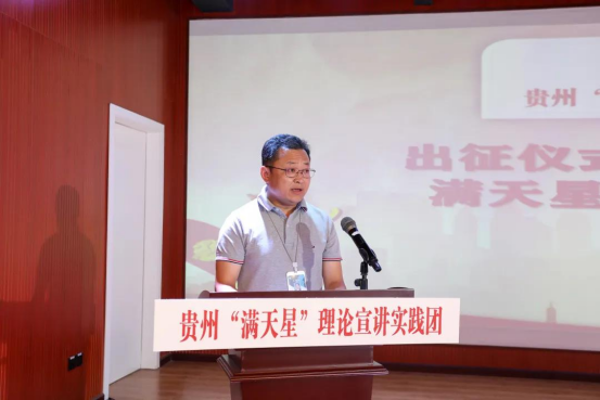 詹黔江致辞,他寄语全体队员树立面向基层、建功立业的成才志向,把社会实践与专业学习、服务社会、就业创业结合起来,虚心向群众学习,向社会学习,用火种点亮山区的每一颗星星,织就漫天繁星,照亮乡村振兴的道路。
