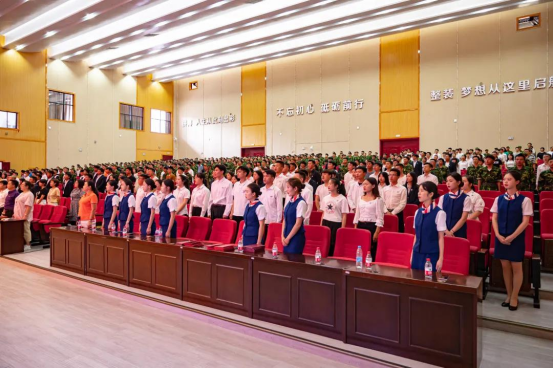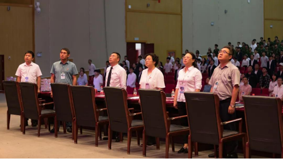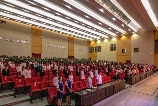 下午14时,学院领导、来宾、教职员工代表先后步入礼堂,现场顿时掌声如潮、欢呼不断。少顷,激昂的《义勇军进行曲》响起,在场的学子们齐声高唱,场面庄严肃穆。